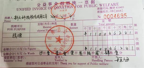 2月4日下午,新天科技股份有限公司捐贈100萬元,新天科技股份有限公司全體員工捐贈10.036241萬元,累計捐贈善款110.036241萬元,全部匯入鄭州慈善總會賬戶,用于鄭州市、高新技術開發(fā)區(qū)新型冠狀病毒肺炎疫情的防控工作。