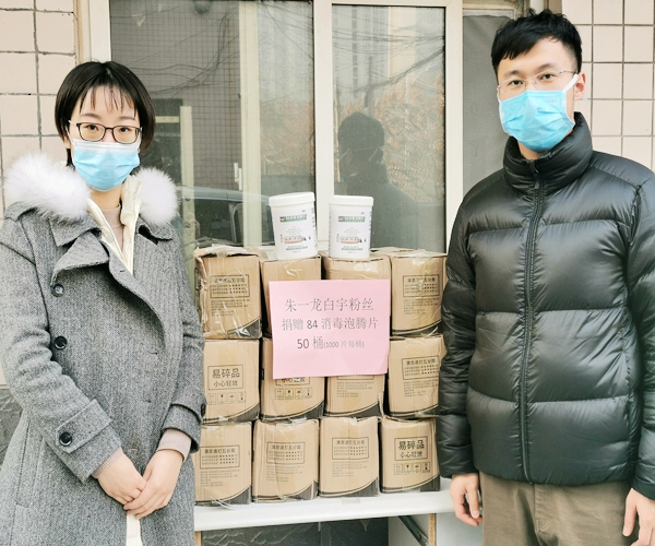 2月11日下午,鄭州慈善總會再次收到“朱一龍白宇粉絲”團捐贈的抗疫物資:84消毒泡騰片100桶,每桶1000片。按照捐贈人意愿,我會將物資捐贈給河南省人民醫院、鄭州市第六人民醫院這兩家首批“河南省新型冠狀病毒感染肺炎”省級定點醫院,每家各50桶。