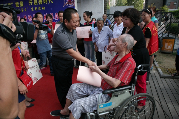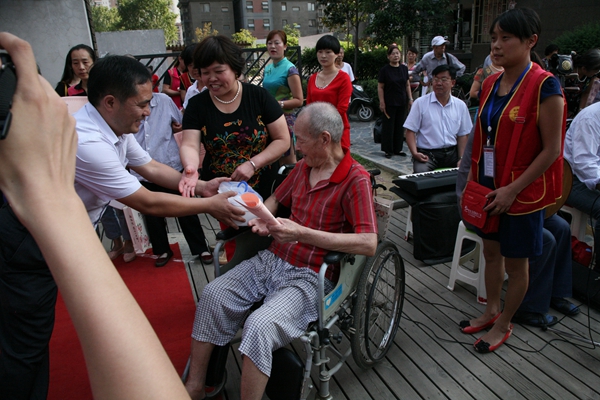 活動隨著一曲歡快的盤鼓開場,河南愛馨養老集項目辦代表王磊發表了中秋祝詞;兩名來自社區的老年書法愛好者現場揮毫,寫下了2014鄭州慈善日主題及中秋寄語,鄭州慈善總會副秘書長周培功為他們贈送中秋月餅;一曲文藝節目后,多家社區慈善志愿者工作站共同簽約“社區親情承諾書”,承諾工作站將不遺余力的對老人的提供關懷與幫助;來自社區的十名老人代表與其子女共同簽約“家庭親情承諾書”,承諾例如帶老人體檢、拍攝全家福等看似簡單卻充滿溫馨的天倫之樂。承諾書中表達的雖然是小事,卻是子女對父母老年生活的愛與關注;簽約后,總會為老人送上了中秋月餅,鄭州市第二人民醫院還為他們贈送家庭常備的“愛心”小藥箱以表關懷。活動最后,市二院的義診醫療團隊講解了專業的醫療知識并由社區呈現上精彩的文藝演出,與居民共迎中秋。