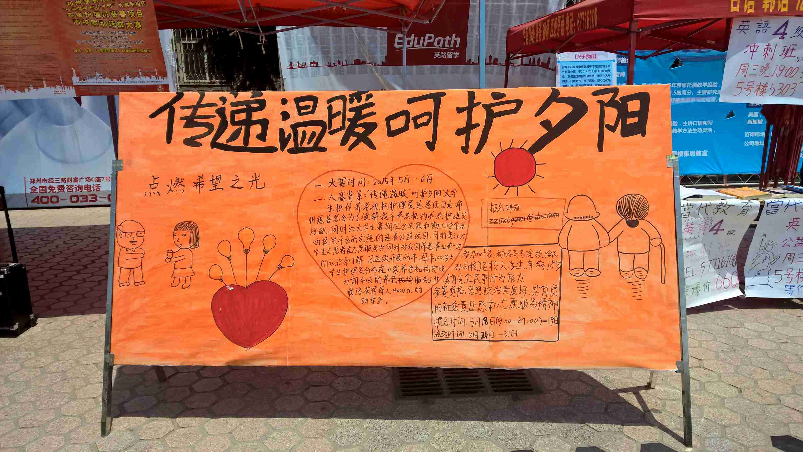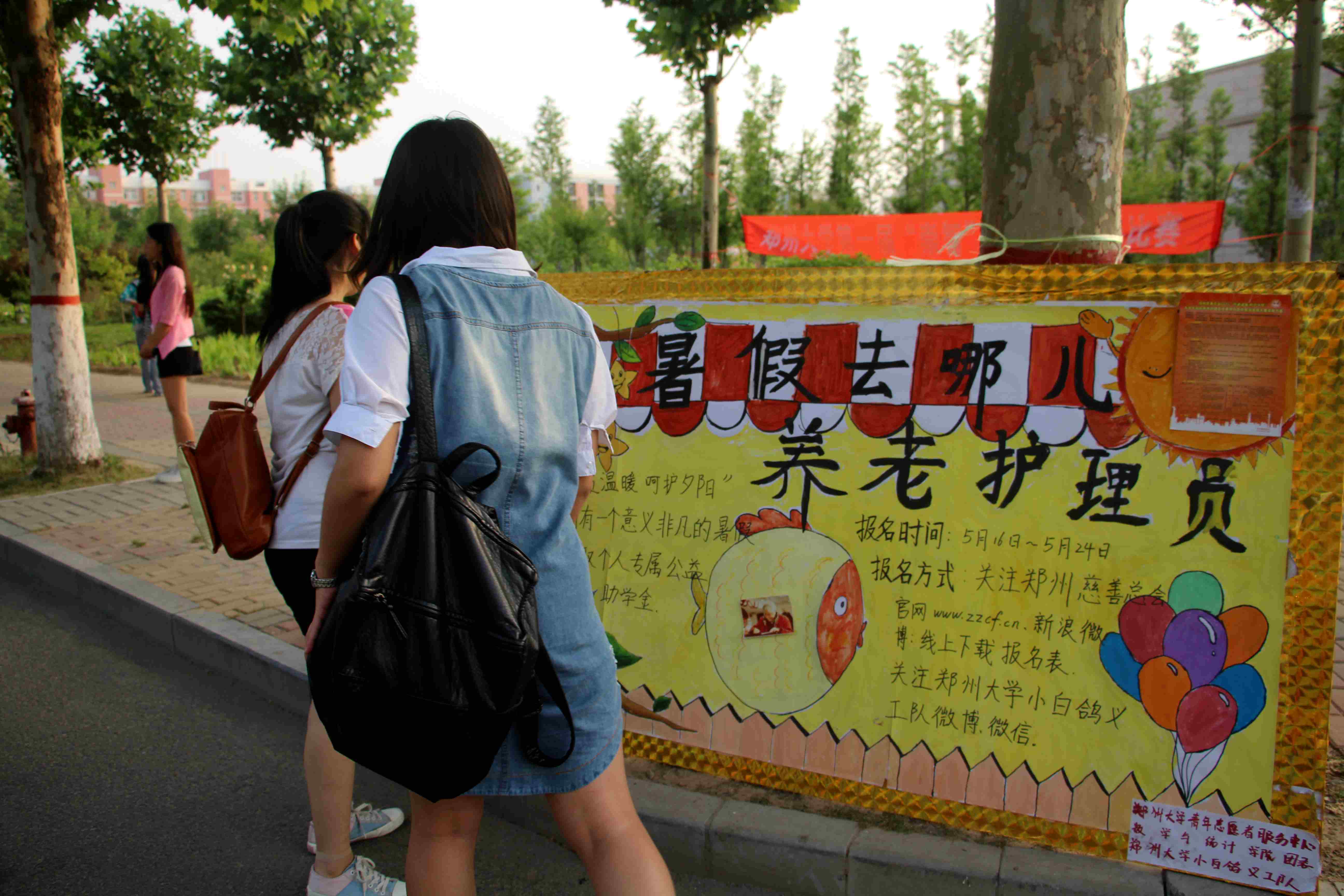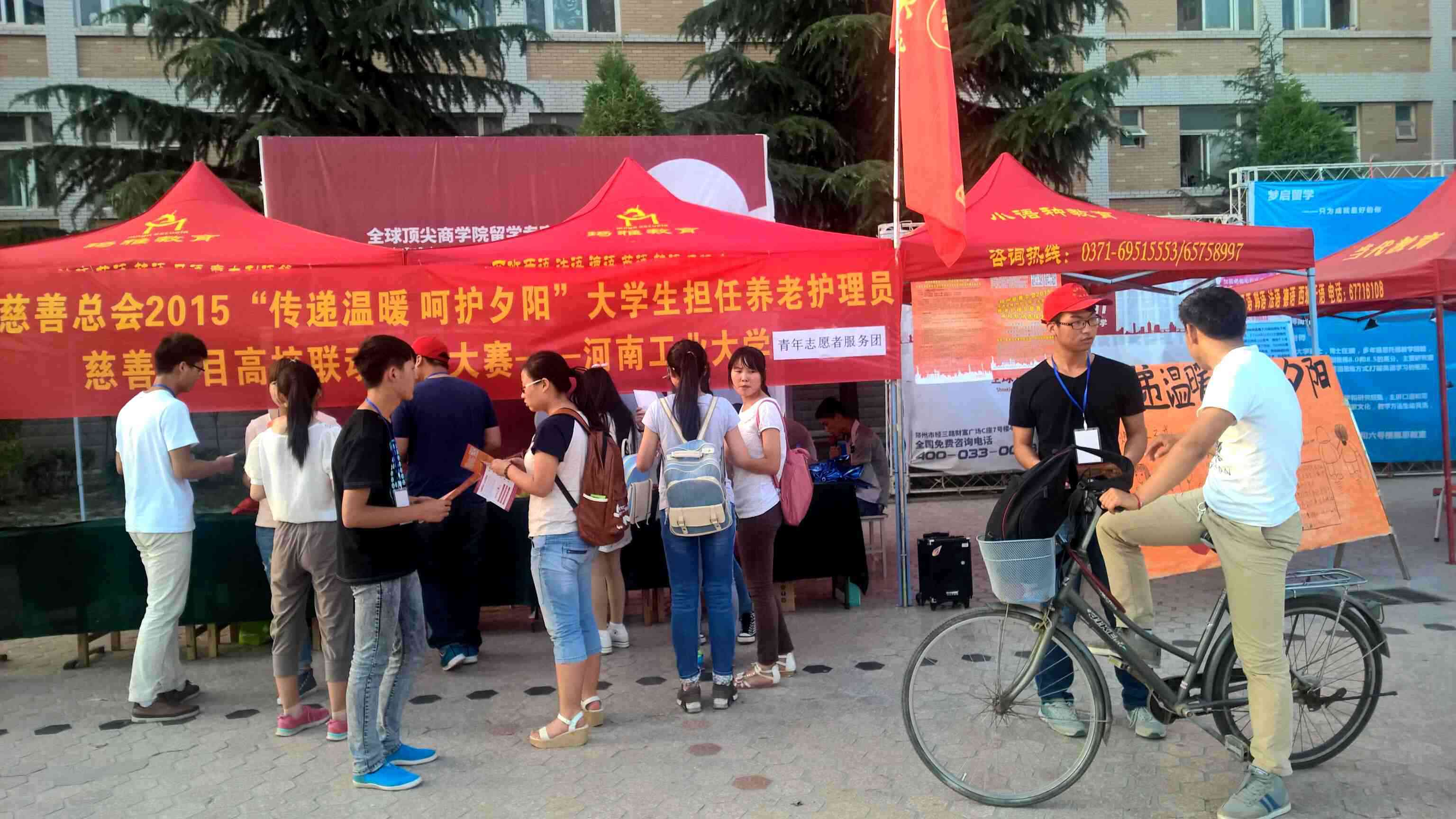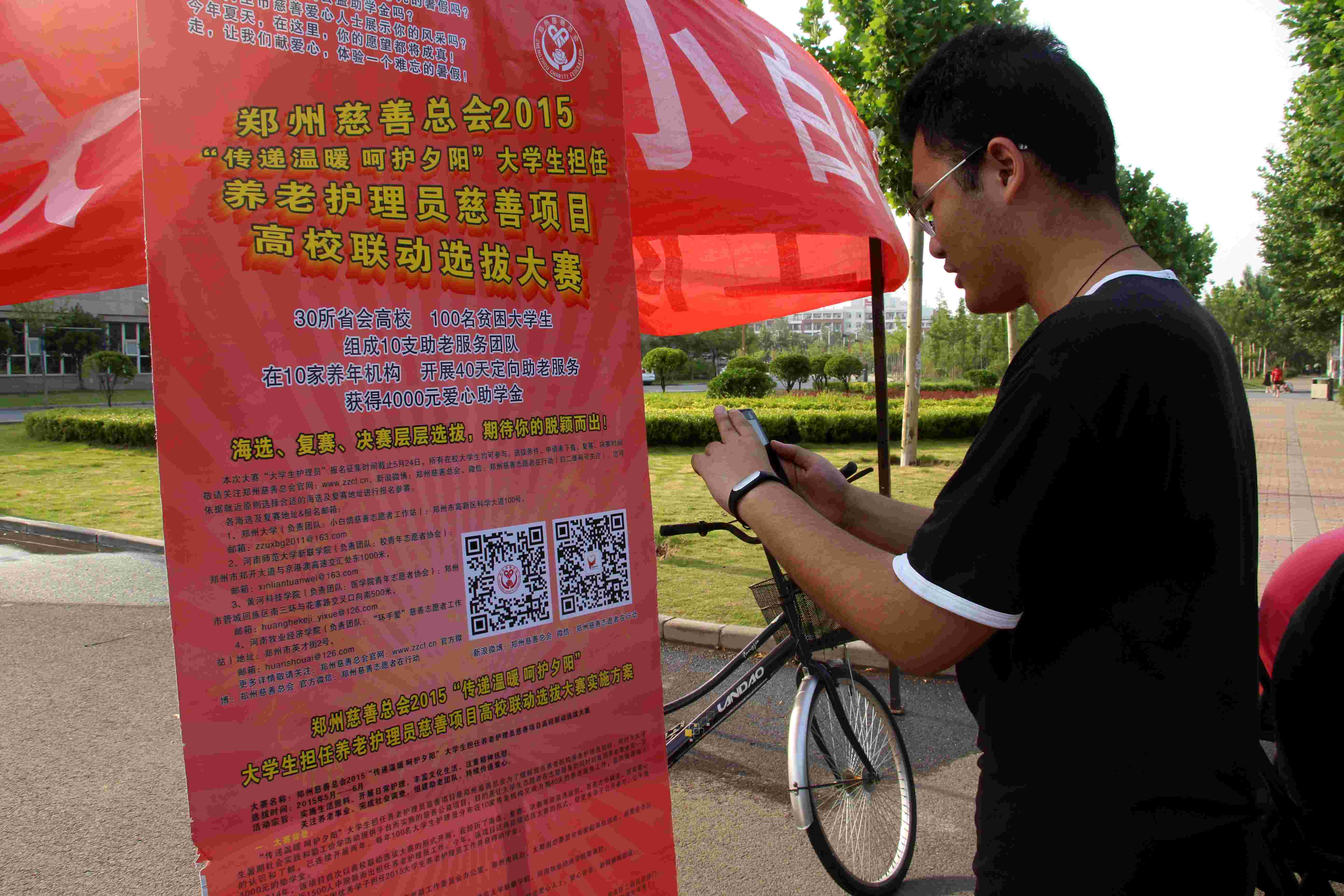 5月16日,鄭州慈善總會啟動2015“傳遞溫暖 呵護夕陽”大學生擔任養老護理員慈善項目高校聯動選拔大賽。幾天來,各高校志愿者積極開展外場宣傳活動,號召學子們踴躍報名。現活動仍在招募中,報名時間為5月16日至24日,望廣大符合條件學子積極踴躍參與。復賽將分別于鄭州大學、河南師范大學新聯學院、黃河科技學院以及河南牧業經濟學院4所高校進行。有關大賽的最新消息請登錄鄭州慈善總會官網:www.hyyjz.com或關注新浪微博:鄭州慈善總會、微信:鄭州慈善志愿者在行動查詢。小伙伴們還等什么?趕快行動吧!